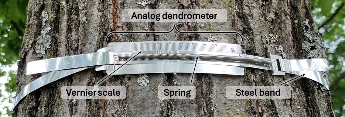 Analog dendrometers consist of a spring-loaded "vernier" scale engraved on steel, which is also attached to the tree with a steel band. As the tree grows or shrinks, the spring gives way, the scale reflects the deflection, and the corresponding value can be read on the scale (Palmer & Ogden 2012).
