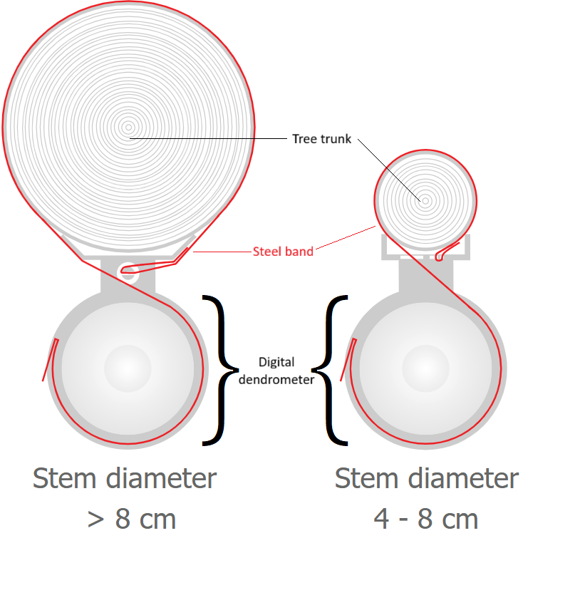 Digital dendrometers consist of a linear digital potentiometer in a housing, which is attached to the trunk with a steel band. When the trunk expands or contracts, the tape transmits this to the potentiometer by deflecting it (Deslauriers et al. 2007). The measurement can be stored in a fixed time interval by the digital dendrometer. The change in stem diameter can be recorded with a resolution of 0.001 mm (https://www.emsbrno.cz/p.axd/en/Dendrometer.DRL26D.html).